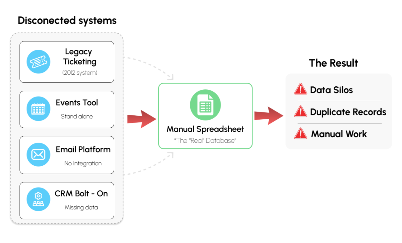 - Each tool works, but nothing connects, and every handoff loses data. As tools evolve, staff turns over, and initiatives shift, the technology gets more siloed. The result: duplicate records, ghost donors, emails to the wrong segment, and reports that contradict each other.